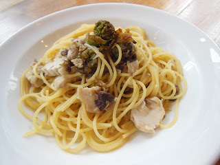 Spaghetti con scamblo e tiori di tartaraccio olive al’ aglio e olio.