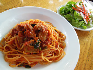 Spaghetti con tonno stufato al salsa di pommodoro(con origano).